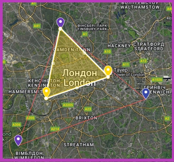 Вторым треугольником, где в основании он указывает Tower, Southwark Cathedral, the Palace of Westminster, Westminster Abbey и West Brompton Cemetery, по его мнению является фигура с вершинами:
