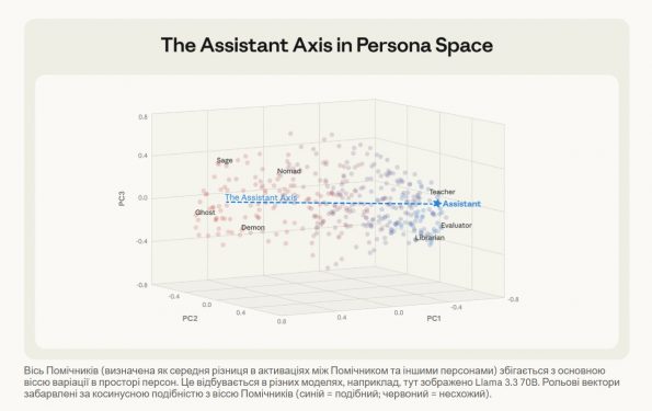 Іллюстрація з статті The assistant axis: situating and stabilizing the character of large language models «картування простору персонажа», де ми можемо побачити, що персон може бути велика кількість. Тут вектори (тобто паттерни нейронной активності моделей) відповідають 275 різним архетипам персонажів.