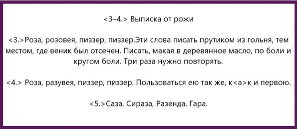 От 10 до 9, от 9 до 8, от 8 до 7, от 7 до 6, от 6 до 5, от 5 до 4, от 4 до 3, от 3 до 2, от двух до одного, от одного – чтобы не было чирья ни одного. Во имя Отца и Сына и Святого Духа. Аминь. От одного – штобы не было чирья ни одного. Обваживать 6 головку чирья ножом, когда говоришь. (Оверед– ср.веред‘нарыв, гнойник, ушиб, любое заболевание, связанное с повреждением кожного покрова’ (АОС 3: 105).