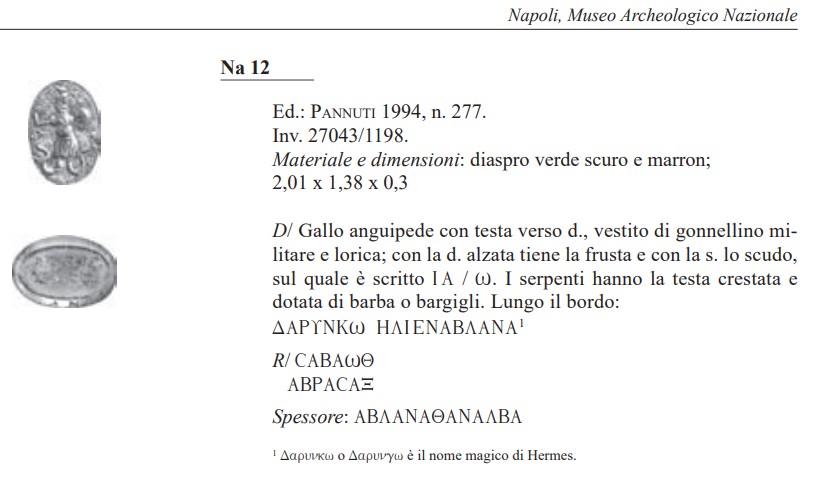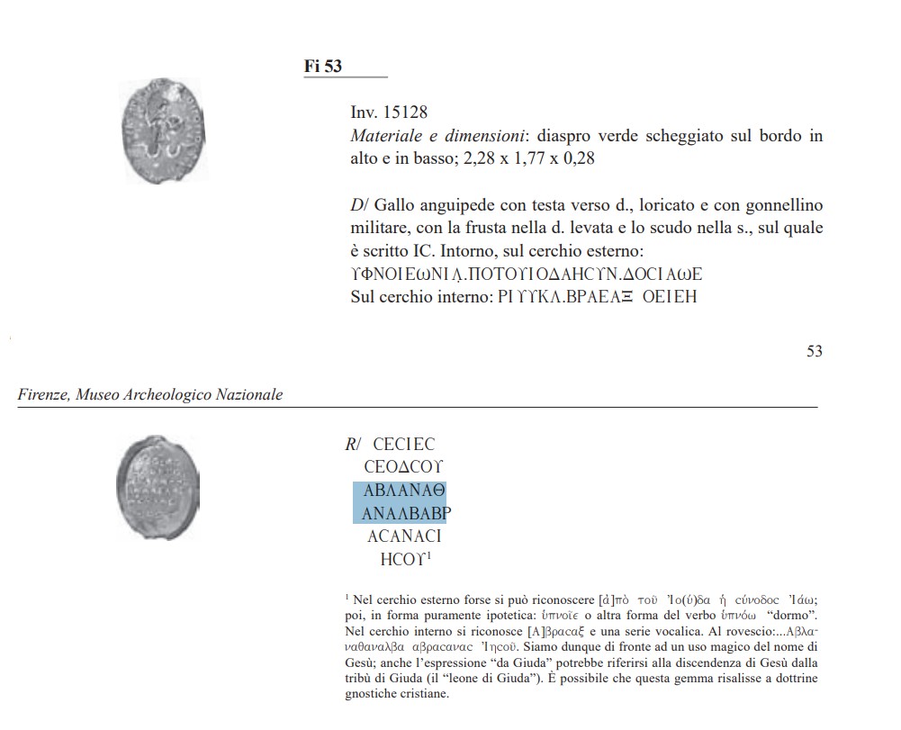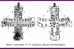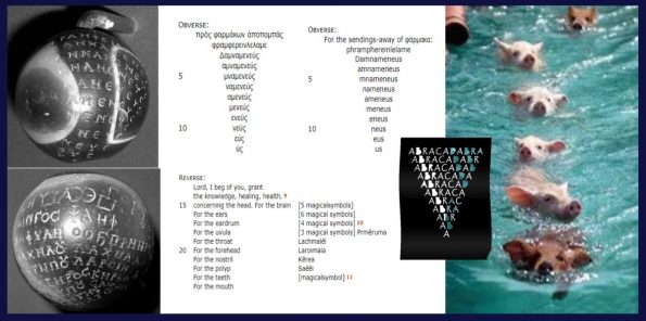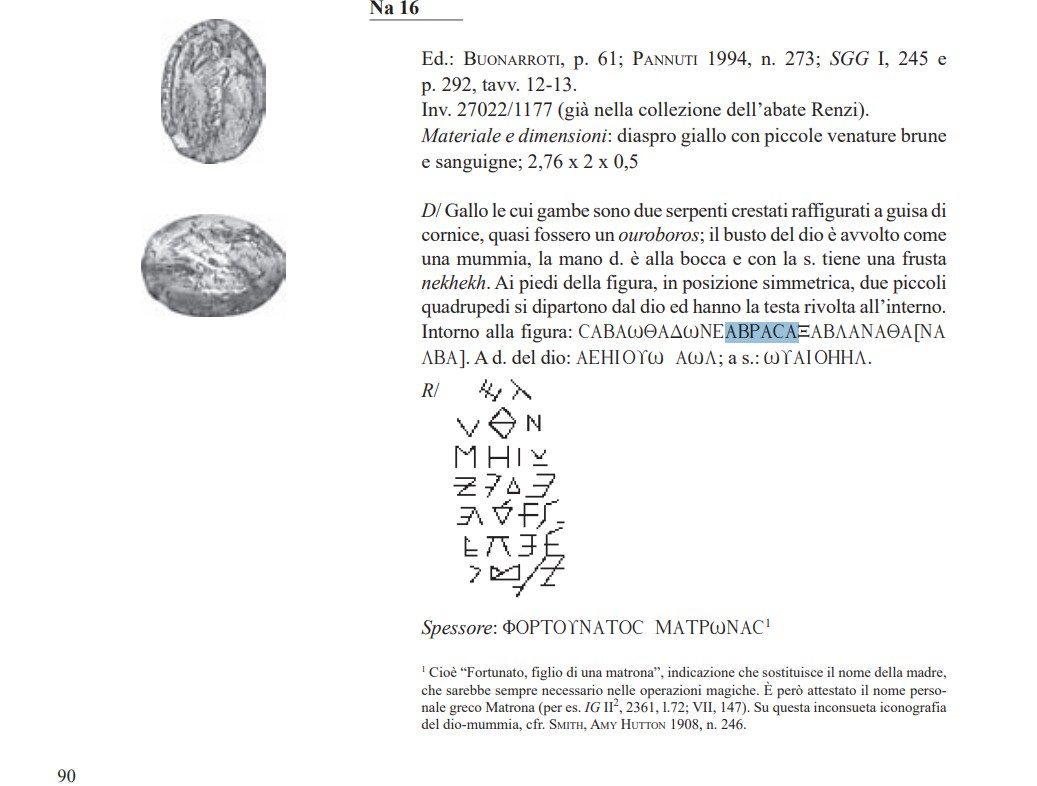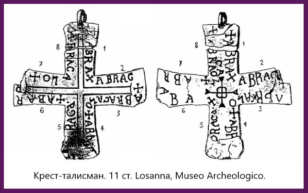 Но вернемся к абракадабре с научной точки зрения. Паоло Мартино указывает на гемму (gemme antique de basse époque, Deonna 1944, 121 sg) где абракадабра появляется в первый раз и где ABRA — KADABRA вероятно имеют отдельное функционаирование. Кроме того он указывает на крест из Лозанны. где мы можем также увидеть формулу ABRA как самостоятельную. И тогда первая часть формулы (кроме того что произносится неверно, а в магии это немеряно важно) это некий демон ветра. Как говорится — надуло. А надул проблемы и болезни демон абра-аура подобный ветру.