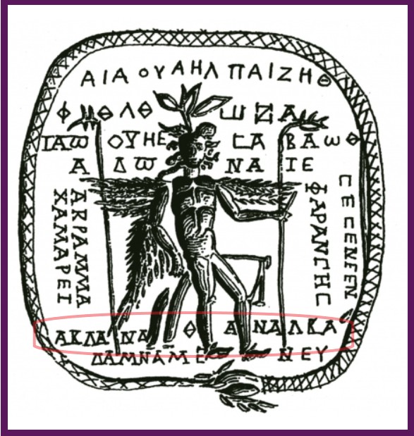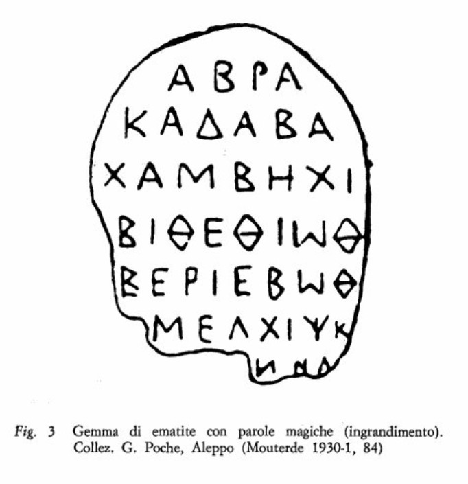 Своеобразная вариация функциональной по форме «абракадабры» появляется в греко-егиептском магическом папирусе, написанном в 3 веке (PMich inv. 6666 = PGM CXXX.)
