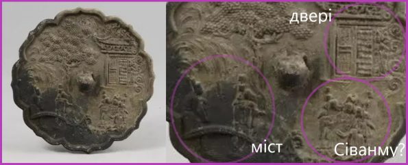 Що можна сказати за образи, що на нас дивляться з зображень старовинних поховань. Зазвичай це жінки, але є серед них й чоловікі. Жінкі в руках можуть тримати орхідею, дзеркало, фрукти. Але в нас є ще один дивний артефакт з жінкою в двірях. Й це дзеркало знайдене в гробинці Ма Шаотіна та його дружини в Хефеї, провинція Аньхой. На ньому зображен міст, жінка в дверях та фігура на троні. Це схоже на один артефакт, пов’язаний з дуже важливой в даоськой традиції трансемперічной істотой на імя Матушка СіванМу.