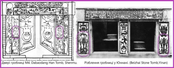 — Але мені більш близька четверте пояснення сцени. Жінка відчиняє двері, щоб показати, що за фальшивими дверима є інший світ. Й це тількі початок бо там за нею, ще є будинки або двори. Таким чином цей сюжет представляє “браму небес” через яку душа власника гробниці йде до іншого світу. Той, хто зустрічає небіжчика це істота, що в первісном зображенні має пір’я та кріла. Можливо це служниця матушки Сіван Му, яка має відвести померлу людину до Володарки Заходу. Й тут ми маємо подивитися на образи небесних нефритових дівчат.