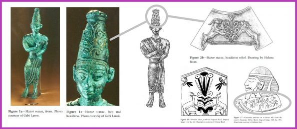 Фигурка бога Баала (?) из Тель-Хацора с Древом и козлами-ибексами на головном уборе. Подобное изображение на одежде египетского пленника из Ханаана и пластине деревянного сундука из гробницы Perpaut.