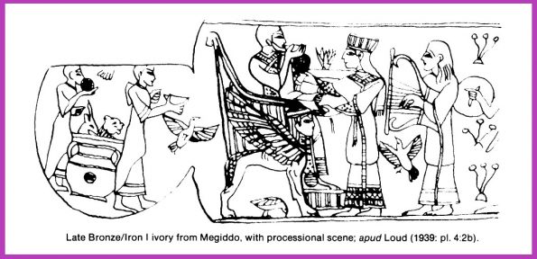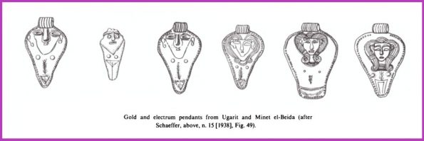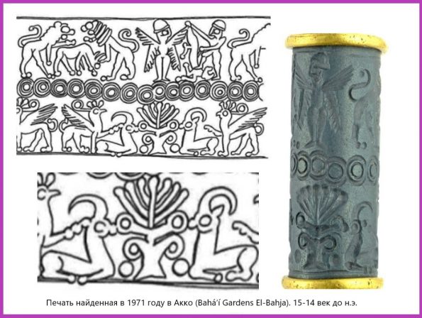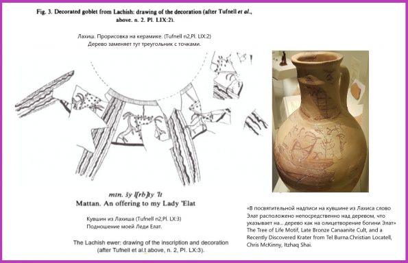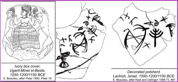 Знаменитая угаритская пластина с изображением богини между двумя козлами и дерево на керамике из Лахиша. Кроме того близка по форме и печать из Oriental Institute Museum, University of Chicago, Chicago, Illinois, USA.