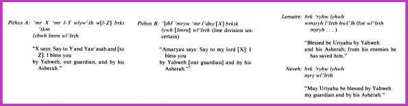 Собственно формула предполагает быть благословленным (с помощью) Яхве, защитника, и его Ашерой. Но дискуссии гебраистов продолжаются ибо не могут окончательно решить Ашера это посредник-деревянный шест-жезл-артефакт или богиня. У них там трудность «при использовании третьего суффикса мужского рода единственного числа с личным именем». И поэтому некоторые исследователи считают, что «ашера» здесь это никакая не богиня, а атрибут бога. Однако сцена на пифосе А, может показать о кем идет речь. Тем более, что изображение на нем достаточно легко узнаваемо.