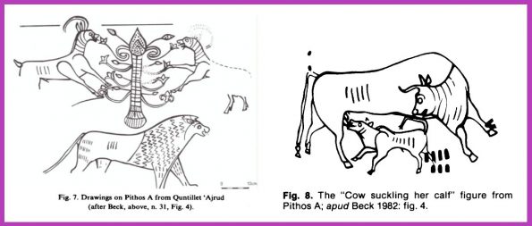 Так же на пифосах есть изображения, которые связаны с богинею в ее классической форме Древа Жизни с и Коровы. Ведь главный бог Эль часто носил эпитет Быка. И здесь мы вновь должны вспомнить за критскую цивилизацию, что видимо была гегемоном в 17-16 веке до н.э. на этих территориях и канула в лету после падения метеорита приблизительно в 1650 году до н.э. оставшись в библейском нарративе как Содом и Гоморра. Так же влияние Угарита и Ассирийской империи.