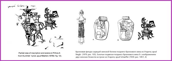 В общем лингвистическо-переводческая битва продолжается и является ли Ашера богиней или ашерат это некие инструменты бога, теорий не одна. Любопытно посмотреть на некоторые символы одежды, как бога из Тель-Хацора, так и ханаанцев. Могло ли это отображать некий инструмент, которым бог мог проявлять свою власть? Есть версия о деревянном символе богини, который называли ашера и именно он стоял в священном месте рядом с алтарем. Поэтому его Ашера или его ашерой l’srth на пифосах Кнутилетт-Ажруда — пока все еще все под вопросом. Ибо надписи на них и изображения тоже пытаются разделить — словно один человек нарисовал, а другой написал и они не взаимосвязаны.