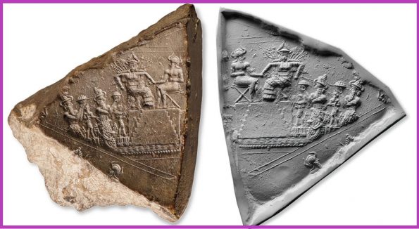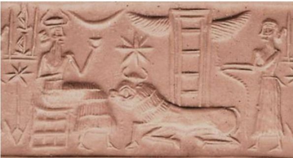 Mesopotamia, Akkadian. ca. 2220–2184 BC. Богиня Іштар у своєму войовничому аспекті сидить на своєму левовому троні на ступінчастій платформі. Навпроти неї, ніби рівний їй, сидить аккадський цар Нарам-Сін, племінник поетеси Енхедуанни та онук Саргона, чий обожнювальний статус також підтверджується його рогатою короною. Він стискає кільце з чотирма прикріпленими мотузками; Іштар однією рукою тримає його за зап’ястя, а іншою веде мотузки за спиною. Мотузки прикріплені до носових кілець полонених гірських богів, які несуть підношення, можливо, дорогоцінні мінерали, та скутих правителів, що стоять на будівлях, що символізують їхні міста. Усі вони дивляться на Нарам-Сіна, який дивиться прямо на Іштар. Владний фронтальний погляд Іштар вказує на те, що саме завдяки її силі та її благословенню Нарам-Сін є царем.