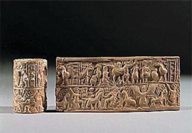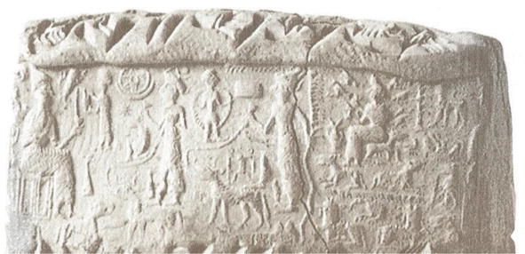 Печать из Мари (3000–2000 гг. до н.э.). Верхний регистр показывает сцену доения, нижний регистр с козами, фигурами героев и орлом с головой льва