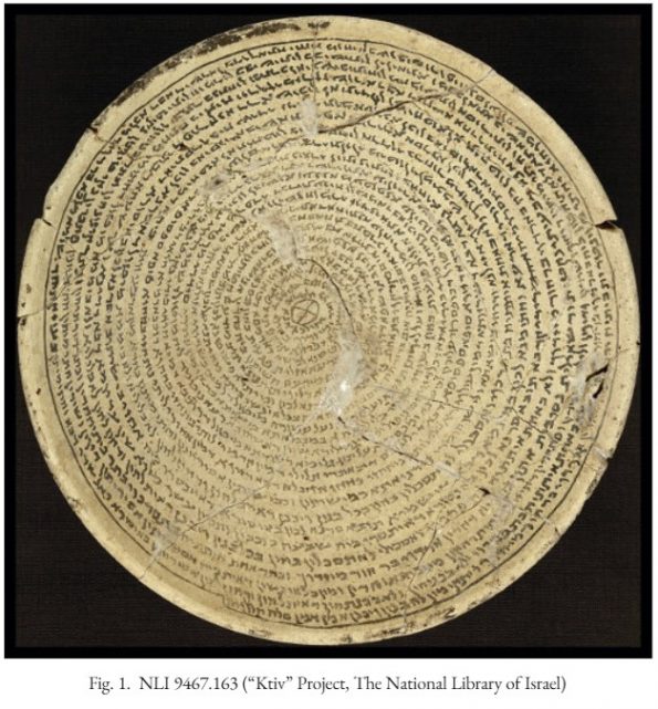 «NLI 9467.163. Ранее неопубликованная глиняная чаша из Национальной библиотеки Израиля имеет размеры 18,9 × 8,1 см и круглое дно. В её центре небольшой круг, разделённый на четыре части (образующие крест), служит центральной точкой, вокруг которой по спирали к ободку идёт длинная надпись. Текст завершается через 24 строки ещё одним кругом, начинающимся после короткой вертикальной линии и охватывающим всю надпись. Чаша была реконструирована как минимум из 15 фрагментов, которые
