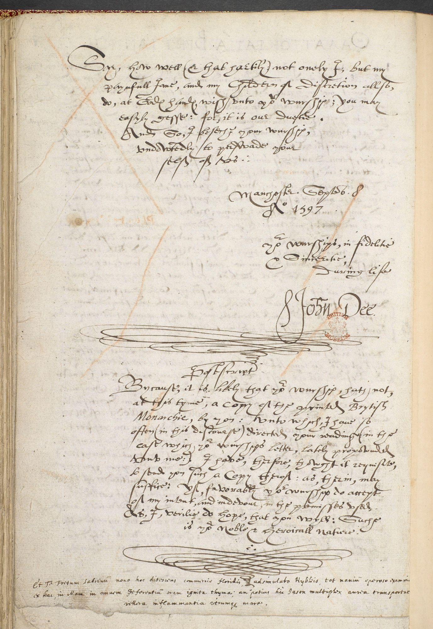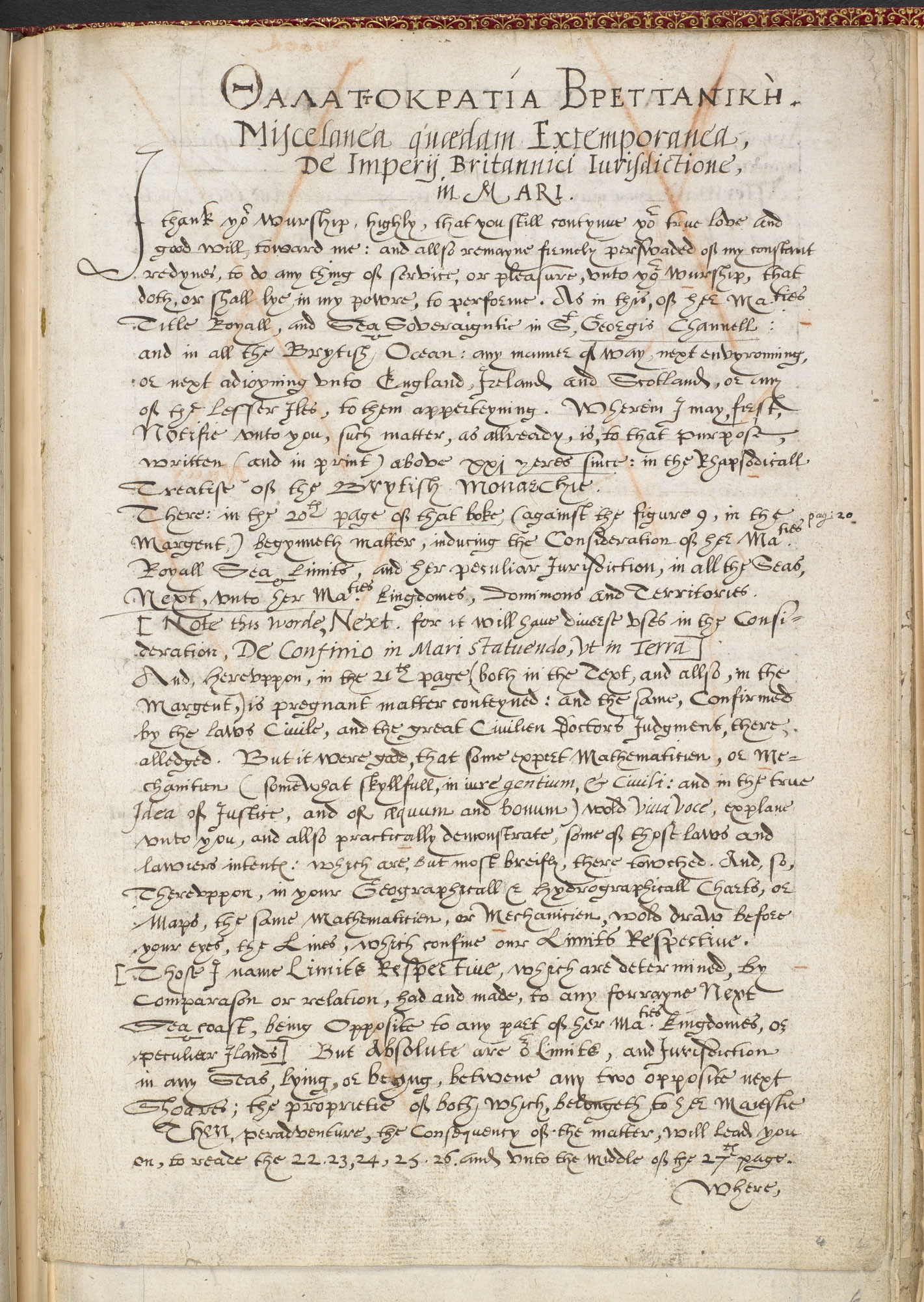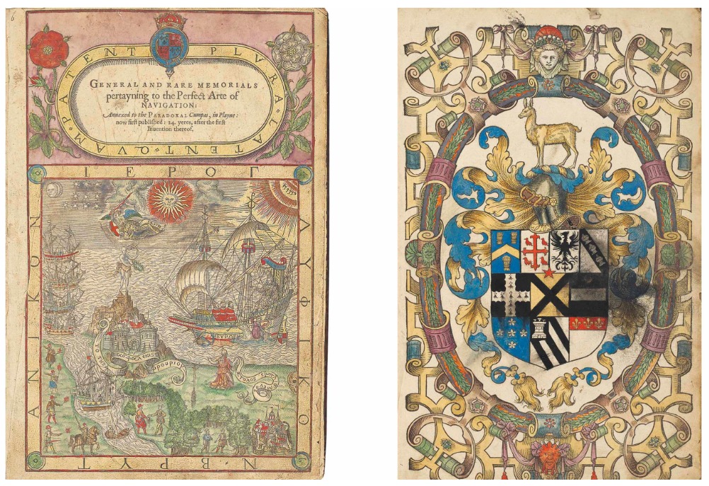Большая аллегорическая гравюра на дереве в названии изображает королеву у руля христианского корабля Европы, а греческий девиз переводится как «хранитель безопасности — вооруженный флот». В таком заданном контексте Ди призывает к созданию военно-морского флота «Pety-Navy-Royall» для защиты нарождающихся колониальных интересов Англии. Это также первая работа, в которой обсуждается морское право; он предлагает налогообложение иностранных рыбаков в британских водах как способ обезопасить рыболовство. На странице 79 указано, что было напечатано только 100 экземпляров. Хотя есть версия 50. Приведу несколько листов рукописной работы Джона Ди 1597 года «THALATTOKRATIA BRETTANIKI» ( Greek title meaning ‘The British Sea- Sovereignty’). Причем с его личной подписью. Из British Library.