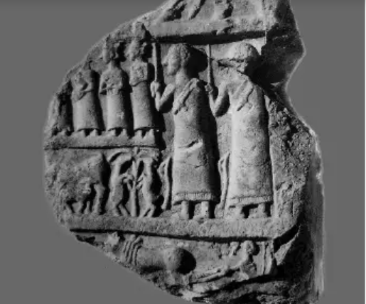 На рельефе два мужчины, высокого административного ранга, связанного с военной деятельностью и три женщины, одна их которых с ребенком на руках. Halawa. 2300 до н.э. (Orthmann 1989, Fig. 44).