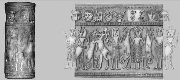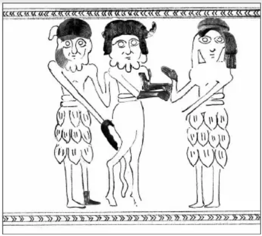 Посмотрите на иллюстрации изображении двух мужчин и процессии женщин, одна из которых с ребенком. Да здесь присутствует иерархическое различение размеров фигур по размеру, но зато под ними мы можем увидеть классическое изображение козлов и дерева жизни, а также корову (?) и теленка, как символ богатства и плодородия. Аналогов изображению в южной Месопотамии нет, поэтому ученые затрудняются в трактовке. Жаль, что нам известно об этом так мало.