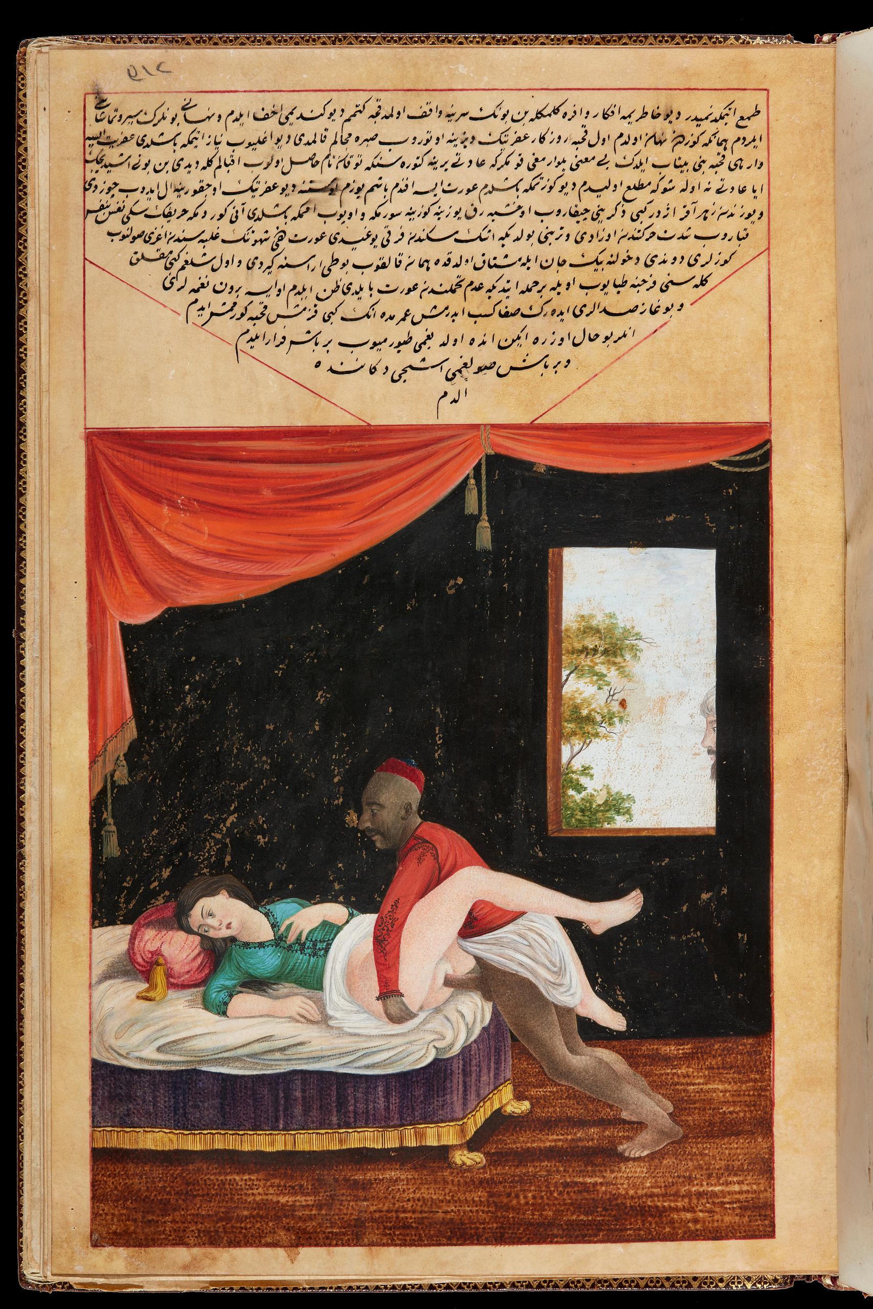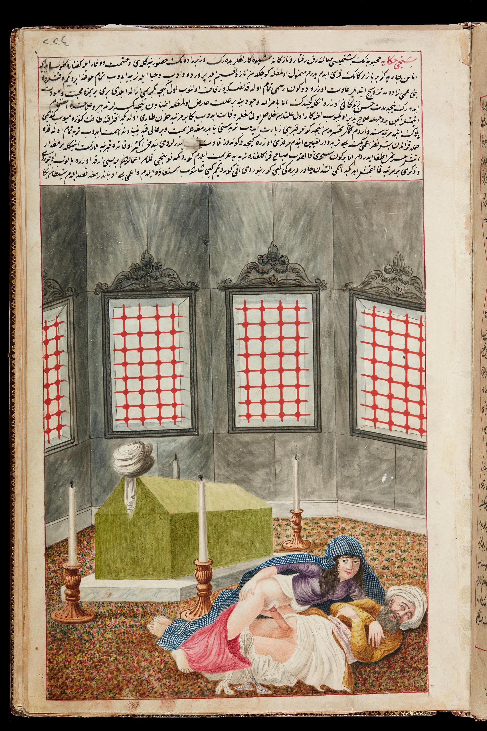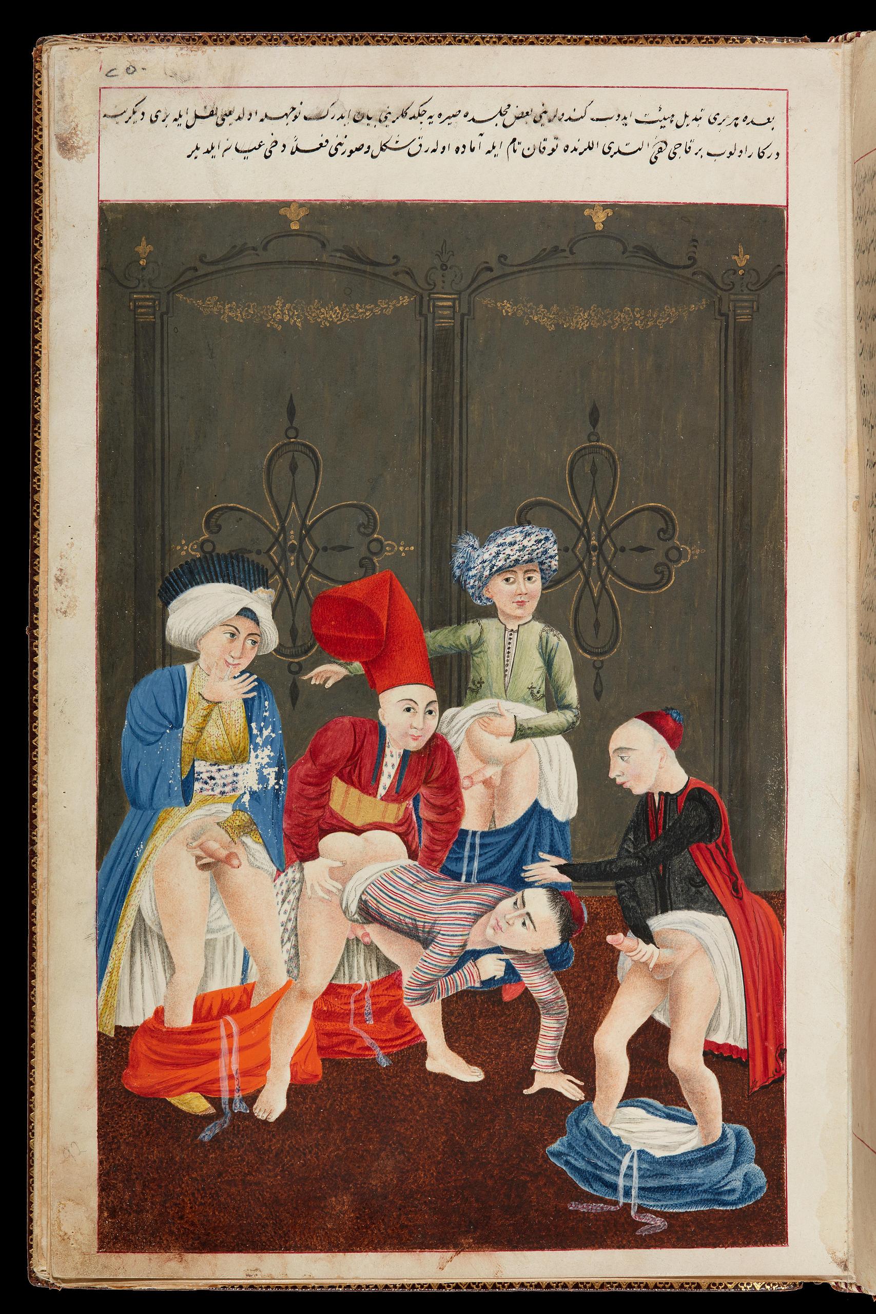 «Мініатюри Хамсе зображують гомосексуальні зустрічі між поколіннями, хоча «активним» партнером не завжди є старший. Цікаво, що в цих сценах зображена не лише пара, яка займається статевим актом, а й численна аудиторія; в одному випадку чоловіки, присутні на сцені, всі мастурбують. Є також низка сцен, що зображують гетеросексуальний статевий акт. В одній чоловік та його наложниця, що перебувають у пориві кохання, потрапляють під удар барана та викидаються в зайняту кімнату, на загальний подив. В іншій пара займається статевим актом у кіоску, мотив, який повторюється все частіше протягом вісімнадцятого століття, про що буде сказано пізніше…»