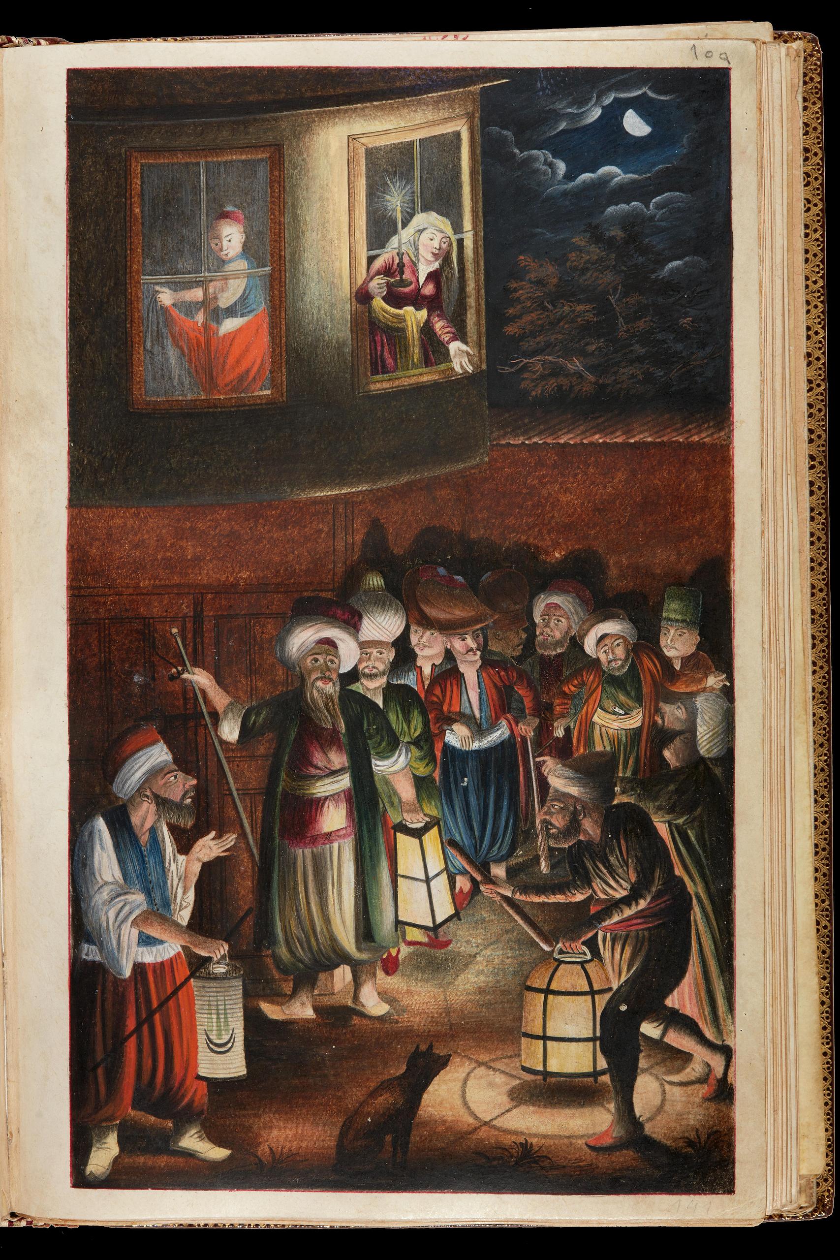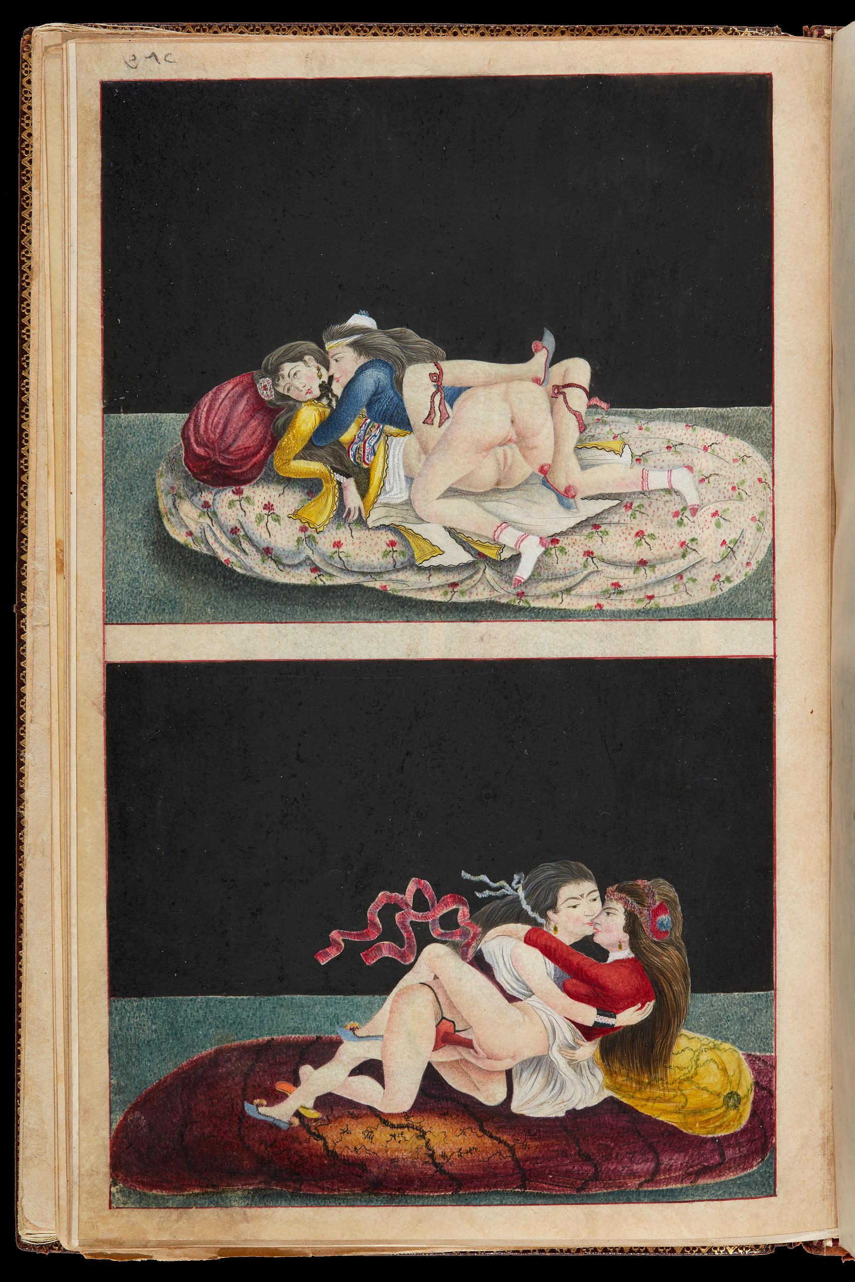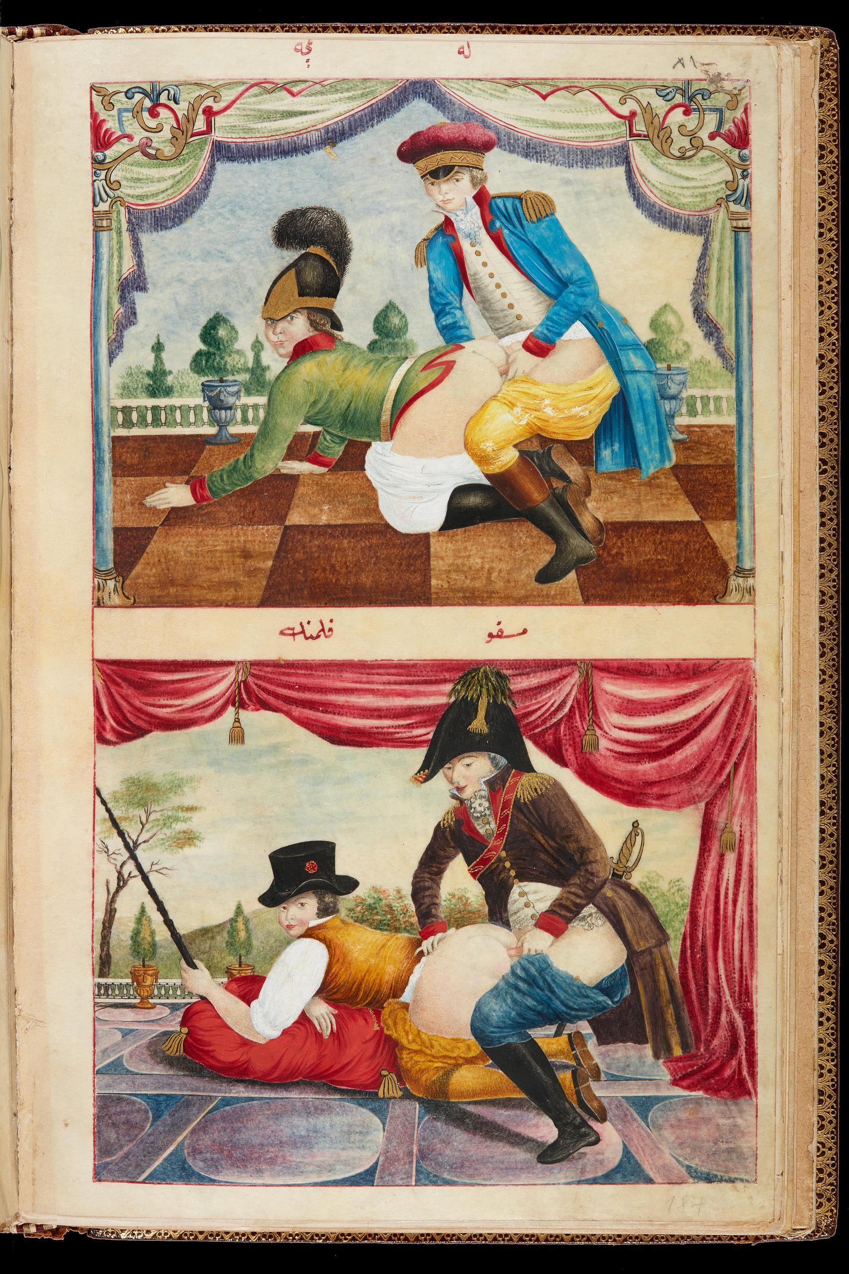 Повна назва в науковій літературі «Homoerotic scene, from a manuscript of Rujūʿ al-Shaykh ilā S ̣ ibāh , İstanbul, 1214 and 1232 AH/1799 and 1817 CE, gouache on paper, 21.7 × 11.8 cm, Collection of Mony Vibescu, Paris.