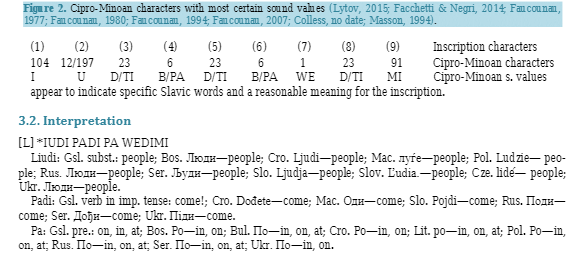 Анализ возможного звукового воспроизведения надписи (27 вариантов звучания — «spellings») показал, что надпись имеет значение, только если произносится на славянском языке!!!